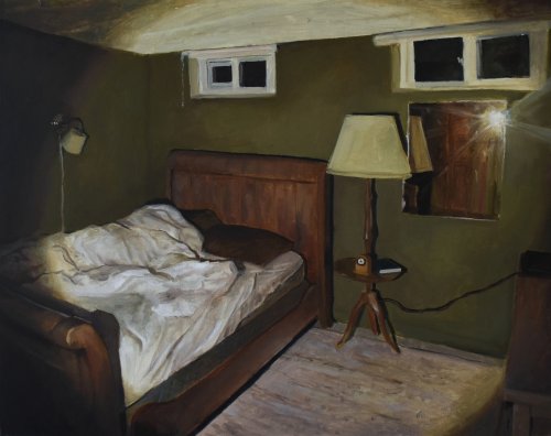 Ash Godley (she/they/he) is an interdisciplinary artist based in Guelph, Ontario. They work primarily in oil paint, using a unique command of light and shadow to depict suburban environments and residential interiors. These quotidian landscapes are made eerie using the dramatic contrast of flashlight beams, tv screens, and camera flashes, which are translated into paint from Godley’s photography. With ten years of painting experience, Godley has developed a keen sense of color that allows them to put to canvas the intense lighting and unique distortions captured in these photos. However, the paintings are not direct reproductions as Godley employs measured and fervent brush strokes, celebrating the beauty and unpredictability of the familiar. Godley’s compositions are also positioned from a first-person point of view, allowing viewers to easily place themselves within the images, cultivating their anxieties in the dark, unknowable corners of the frame.