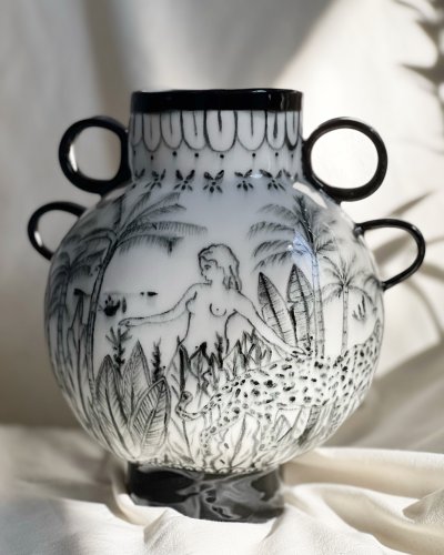 Carolina Delgado-Duruflé is a Colombian Canadian multidisciplinary artist and an interior designer based in Toronto. Her creations combine porcelain flowers, metal, glass, and glazes to create islands of beauty in surprising places. A daughter and a mother, she draws from her personal experience to reflect on tradition, movement and resilience.
