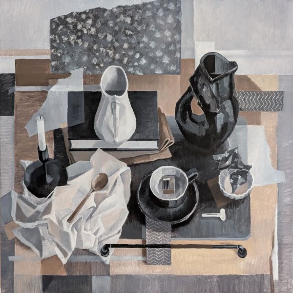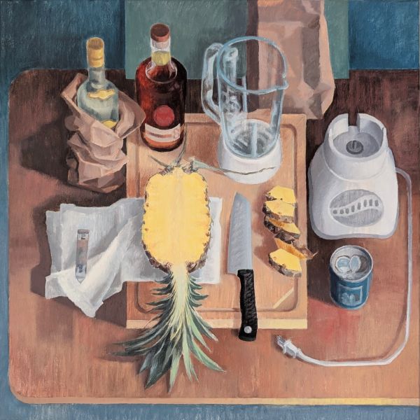 Esther Slevinsky is a multi-disiplinary artist based in Waterloo, Ontario. In 2006 she graduated from ACAD with a Bdes in Graphic Design and Illustration, and worked as a muralist for two decades before transitioning to painting on canvas. Her work explores our connection to food and it’s many purposes: to celebrate, comfort, nourish, express love, reflect culture or tradition, as luxury, or as waste. Inspired by Medieval painting, Esther employs characteristics of Medieval depth in her work with oddly spaced objects and tipped surfaces.
