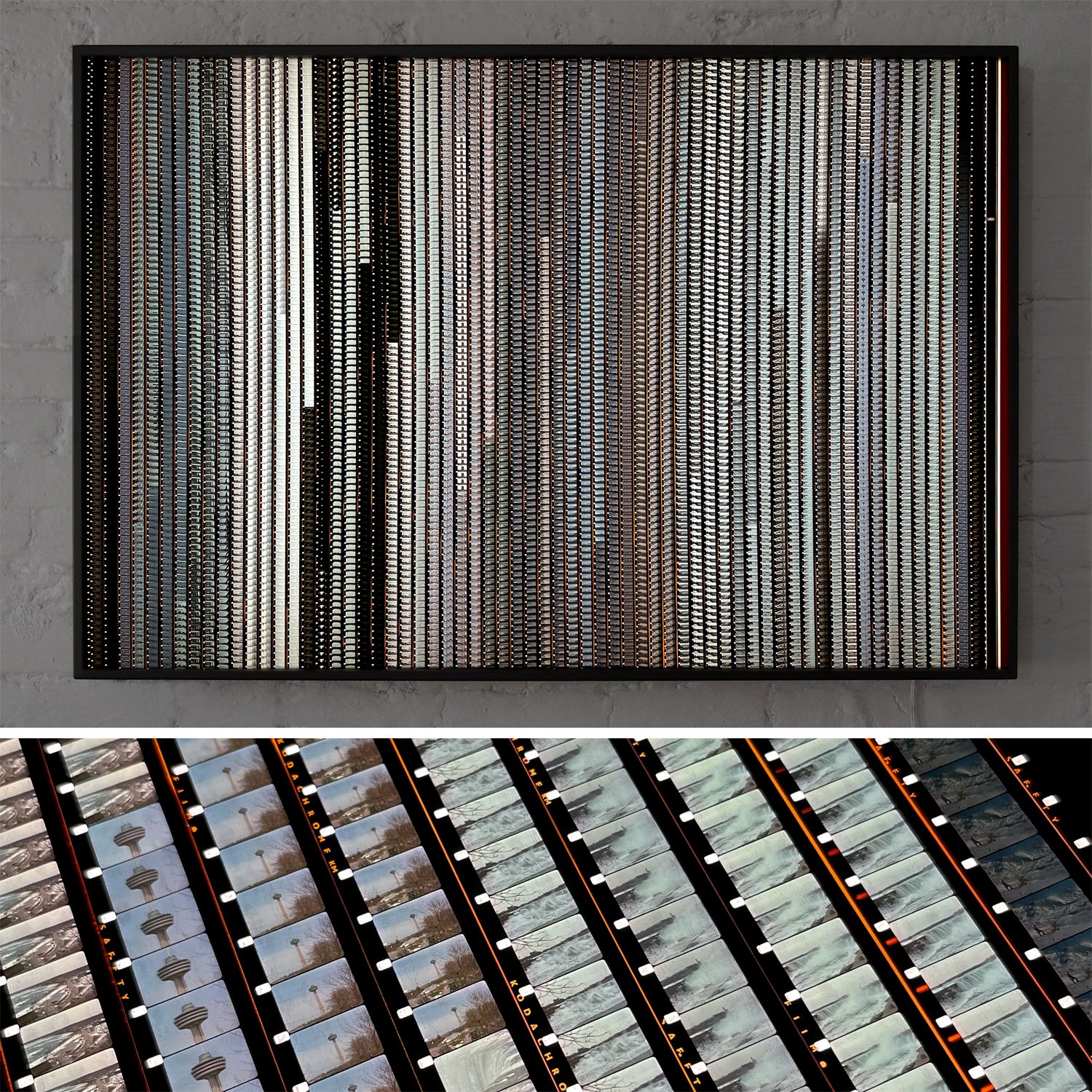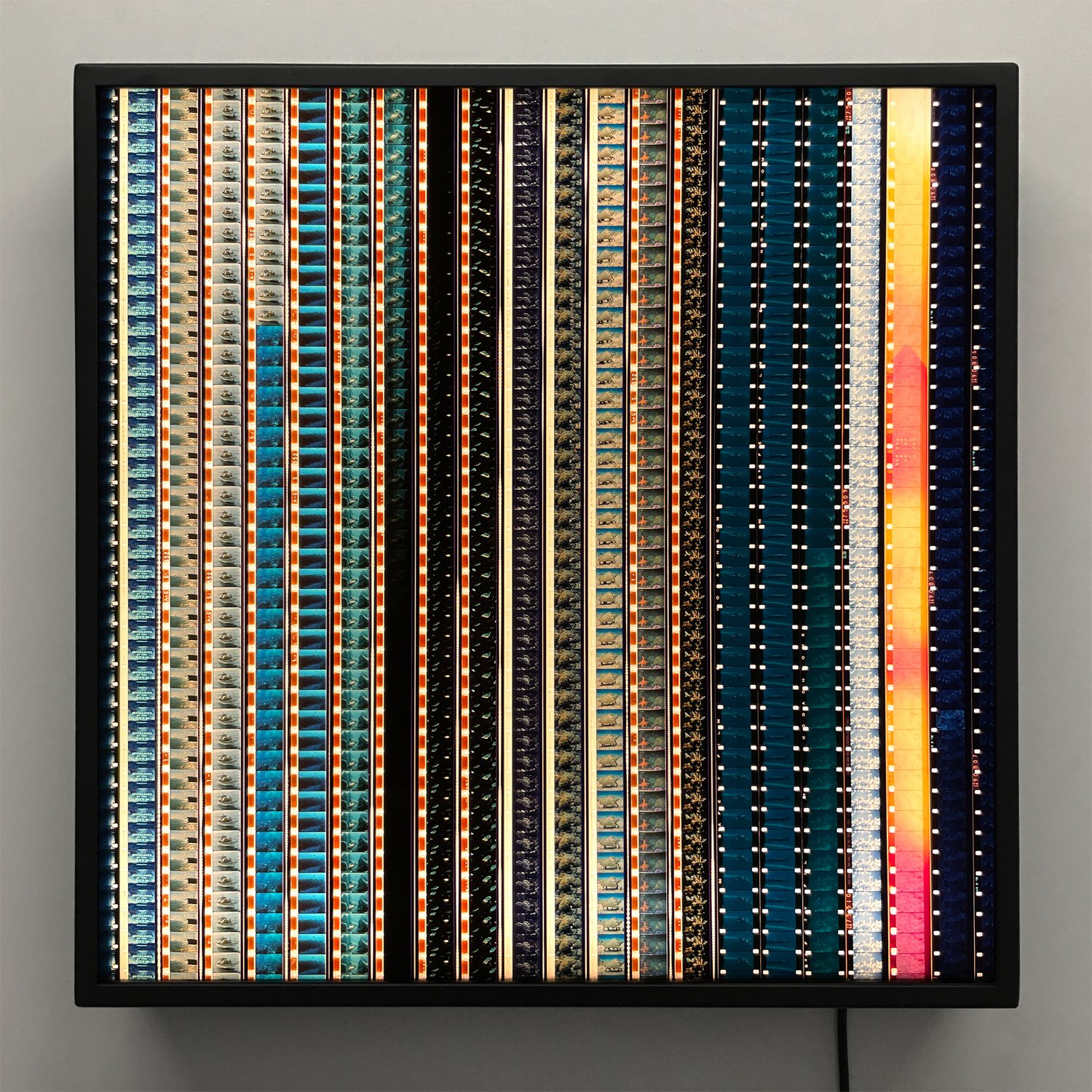 I collect and splice vintage 16mm film, crafting linear-patterned collages that reimagine old narratives. Illuminated in handmade LED lightboxes, my work invites an intimate, close-up viewing experience.