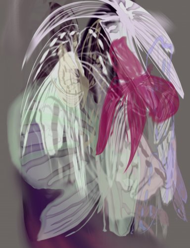 I synthesize analogue drawing from plein air with digital and paint to create a unique response to how nature makes me feel, transformed as if in another world. As well other important influences that affect me include reading poetry, philosophy and science (biology and quantum physics). My work,is an intuitive response with no set plan, whatever comes to me, it is all a play with form, line and colour, as I explore how I feel. Overall my works are an expression of the beauty I find in learning and its ability to expand our knowledge and awareness of self. I also learned recently about the Seventh Generation rule in Celtic culture which is my heritage and the importance of leaving enough. in nature for others to follow. Sadly our treatment of pollinators and plants that they feed off including trees has caused them to be endangered or extinct. So when creating I am calling for our reclaiming the beauty in those interconnections and consider how we are protecting our seven generations. This new series is entitled "Holding UP the World."