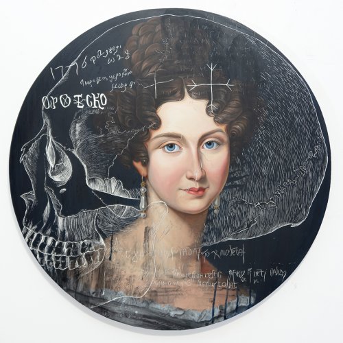 Clear, acrylic, paint marker and spray paint on wood panel, 12x12"