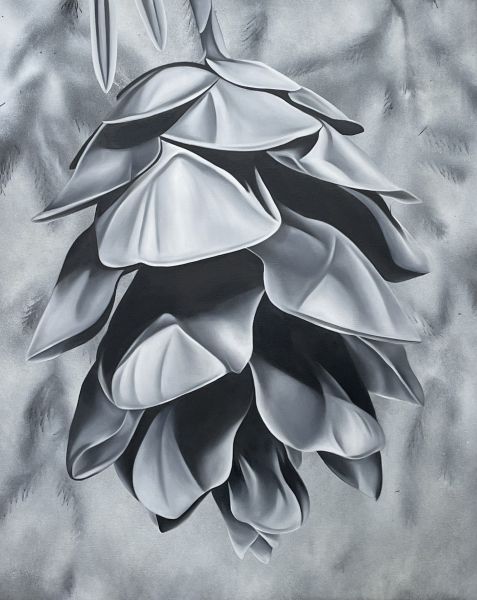 Leah Olsen-Kent is a Canadian artist whose work captures the quiet beauty and serenity of the natural world. Inspired by organic forms and the subtle interplay of light and shadow, she creates atmospheric compositions using spray paint, oil paint, and stencils made from natural objects. Her technique involves layering monochromatic tones and limited colour palettes to build depth and contrast, evoking a sense of stillness and introspection. Deeply rooted in minimalism, Leah’s work encourages viewers to slow down and immerse themselves in the overlooked moments of nature. Her paintings reflect a balance between structure and spontaneity, as she continuously experiments with layering techniques, exploring how background and foreground elements interact. This evolving process allows her to refine her artistic voice while deepening the connection between her work and the natural environment. Working from her home studio in Cambridge, Ontario, Leah finds inspiration in the quiet solitude of her surroundings. She holds a Bachelor of Arts from the Ontario College of Art and Design in Toronto. Through her art, she seeks to create a space for contemplation, inviting viewers to pause and appreciate the delicate beauty found in nature’s fleeting moments.