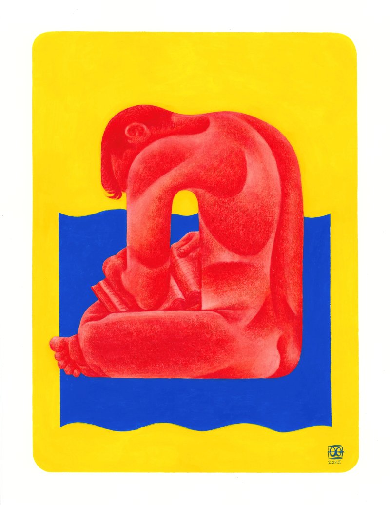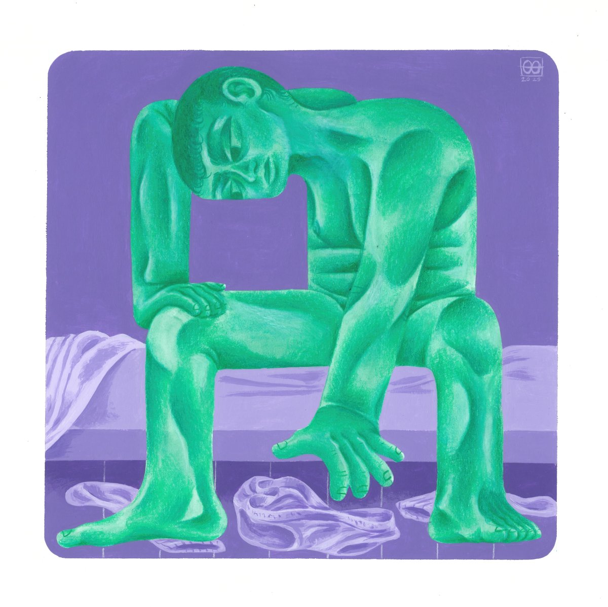 Matthew Walton (b. 1996) is an emerging artist based in Toronto. He holds an Honours Bachelor of Applied Arts in Animation from Sheridan College. Through a mixed-media practice that combines drawing and painting, Walton merges his love of the human form with a distinct graphic sensibility. This marriage births bold, figurative compositions that boast striking textural contrast—a visual tension between softness and the hardness of an unforgiving world. Walton’s work highlights the quiet charm of everyday queerness, reimagining mundane moments through a vibrant technicolour lens. These vignettes invite viewers into intimate, relatable scenes that blur the line between public and private space. It is within this liminal realm that Walton’s camp and Cubist-coded figures live—uninhibited. Drawing from his background in animation, Walton uses body language as a narrative device. By embracing tell-tale gestures and mannerisms once repressed, his work celebrates the freedom of authentic self-expression.