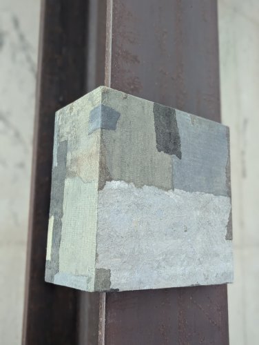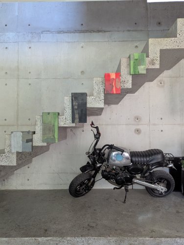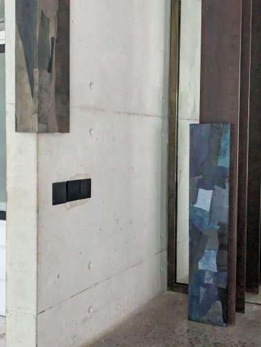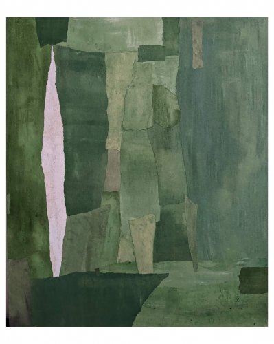 residing between toronto and bali, writer and artist, jules, of moons and jules, abstract minimalist work is layered and torn, much like her world, living wholly in two places. her pieces pay tribute to her island home through materials, to her canadian home through her palette, to a love of patchwork quilts, and to the butterfly inlay joinery of the large farm table that she traced her fingers across during many a meal growing up. an additional run-on sentence about the artist if you'd like to know her a bit more: jules often sips room temperature genmaicha, despite having an inordinate amount of kettles in her collection. smitten with skeleton leaves, other peoples’ nonnas, rain boots, wild blueberries, lower case letters, and oxford commas, she always leaves a forest, or a beach with pocketfuls of finds, claiming squatter's rights to any and all unused pockets within her party should anyone join her on a stroll, for her finds are many and her pockets are few.