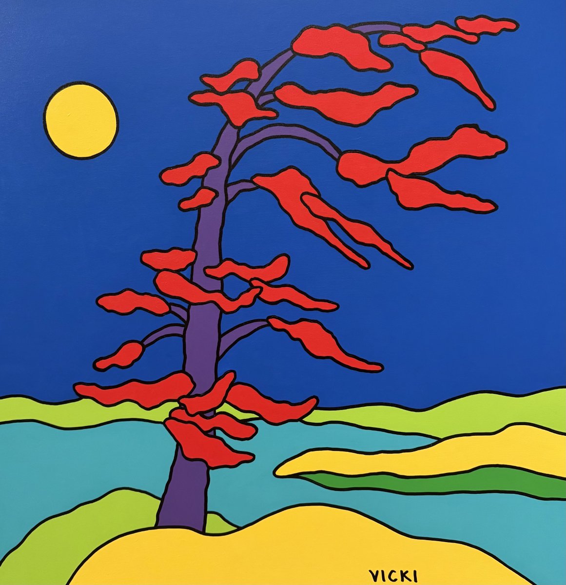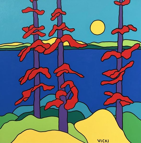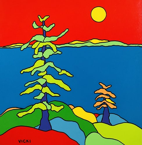 "I see the world in shapes" As a painter Vicki delights in a life of creativity. Through her vibrant themes and hard edge compositions Vicki has captured the beauty of the world around her. The flat smooth surface bursting with bold colour in a very stylized form has become the signature of her work. Vicki has transformed the majestic beauty of the Canadian Landscape into art forms which are fun, energizing and inspiring. Her dedication to art is unwavering and she uses the commitment to fuel her enthusiasm and spirit. Hopes to leave the world just a bit brighter than it was. “my paintings encourage a conversational experience acknowledging that everyone sees the world differently”